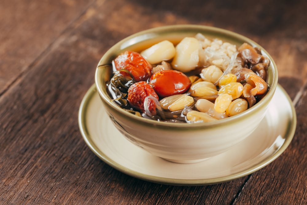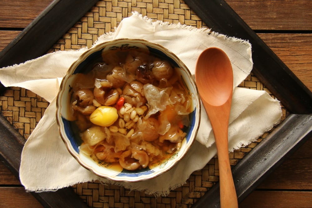 - Khi nước sôi lại mẹ cho phổ tai, hạt bo bo, nấm tuyết hoặc rong sụn, táo đỏ,… vào nấu cùng. Cuối cùng cho thêm nhãn nhục và nêm nếm lại cho vừa miệng. Tắt bếp vì nếu đun lâu trên bếp nhãn nhục sẽ bị mềm.