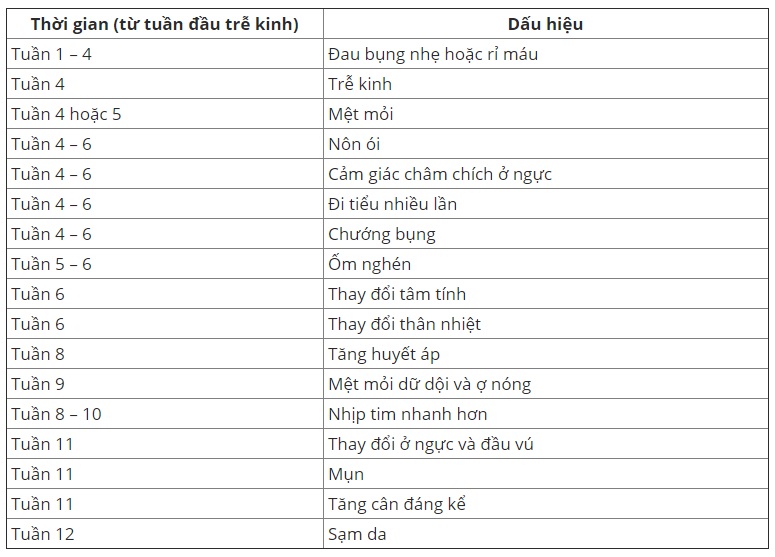 Trên đây là 10 dấu hiệu mang thai tuần đầu tiên sớm nhất. Ngoài ra còn có thêm các triệu chứng có thai khác cụ thể như sau:
