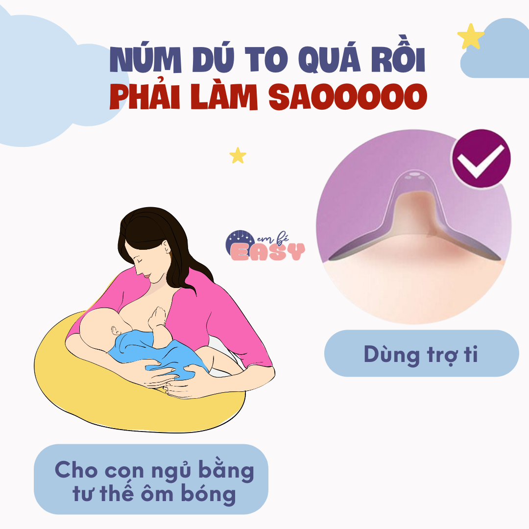 Kích thước của núm zú không phải yếu tố then chốt quyết định việc bé có bú mẹ thành công. Núm to có khó không - quả thực là khó. Nhưng, điểm mấu chốt là bé cần ngậm hết núm zú và một phần quầng zú vào miệng. Nếu chỉ ngậm mình núm, miệng bé sẽ không thể ép vào xoang sữ.a ở quầng zú, dẫn đến ăn không hiệu quả, dể gây sưng và đau núm zú.